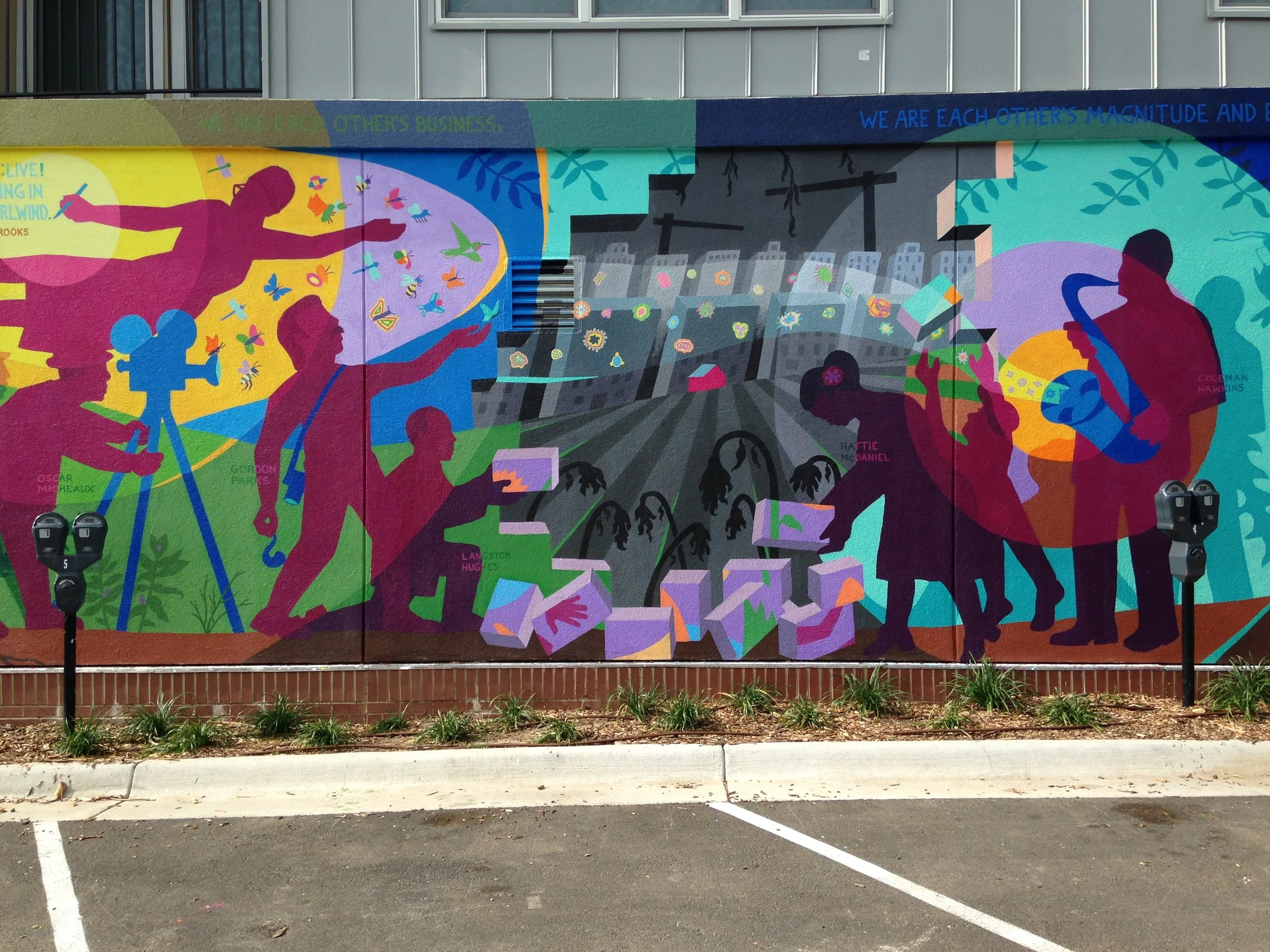 The new design shows the original artists addressing threats to pollinators by working together to rebuild their mural and create a more sustainable habitat for all. In this new design, Gordon Parks, Hattie McDaniel and Langston Hughes reassemble pieces of the original mural, while Oscar Micheaux documents. Coleman Hawkins saxophone plays more than music now as it releases brilliantly colored pollen grains toward awaiting flowers.