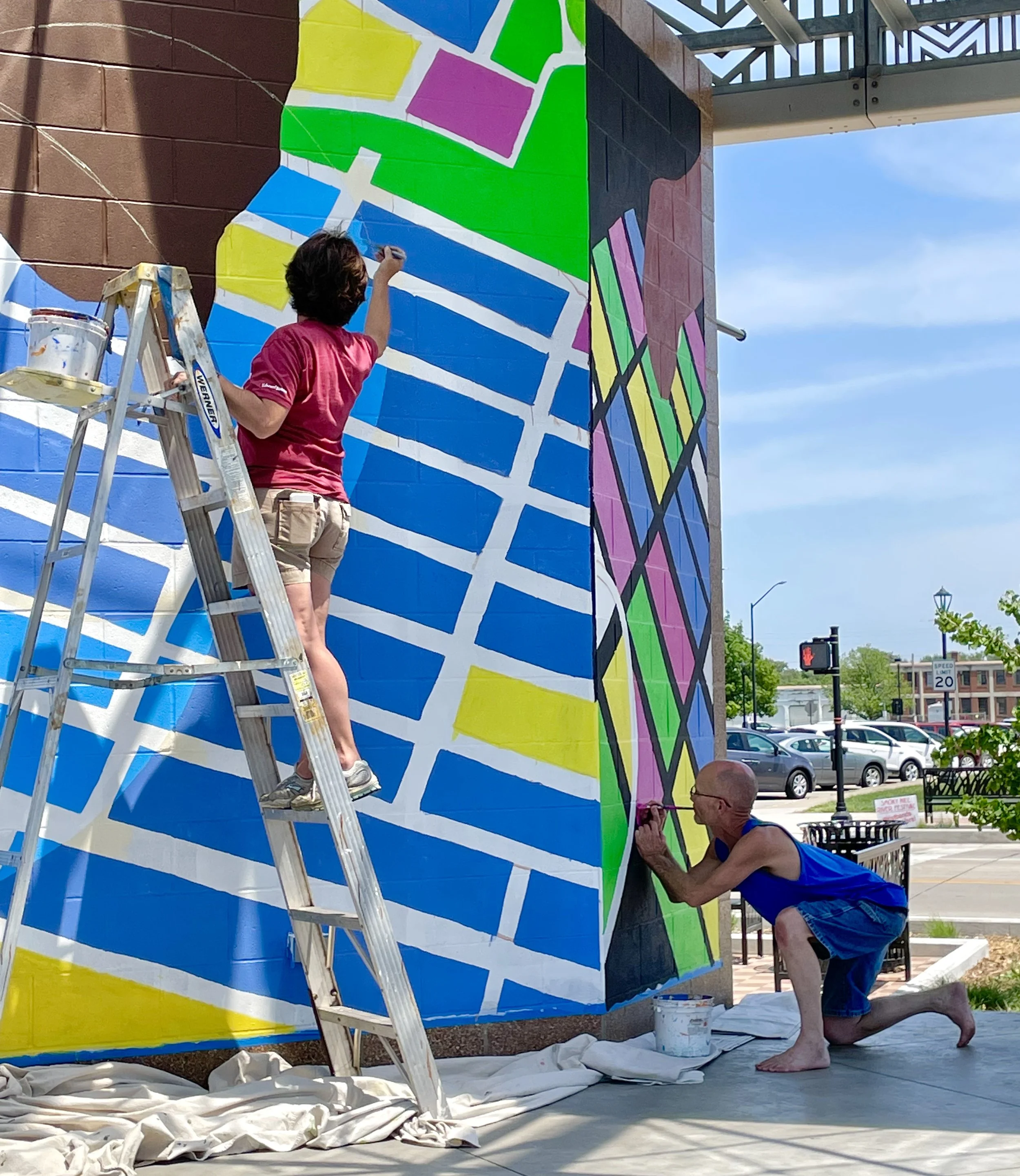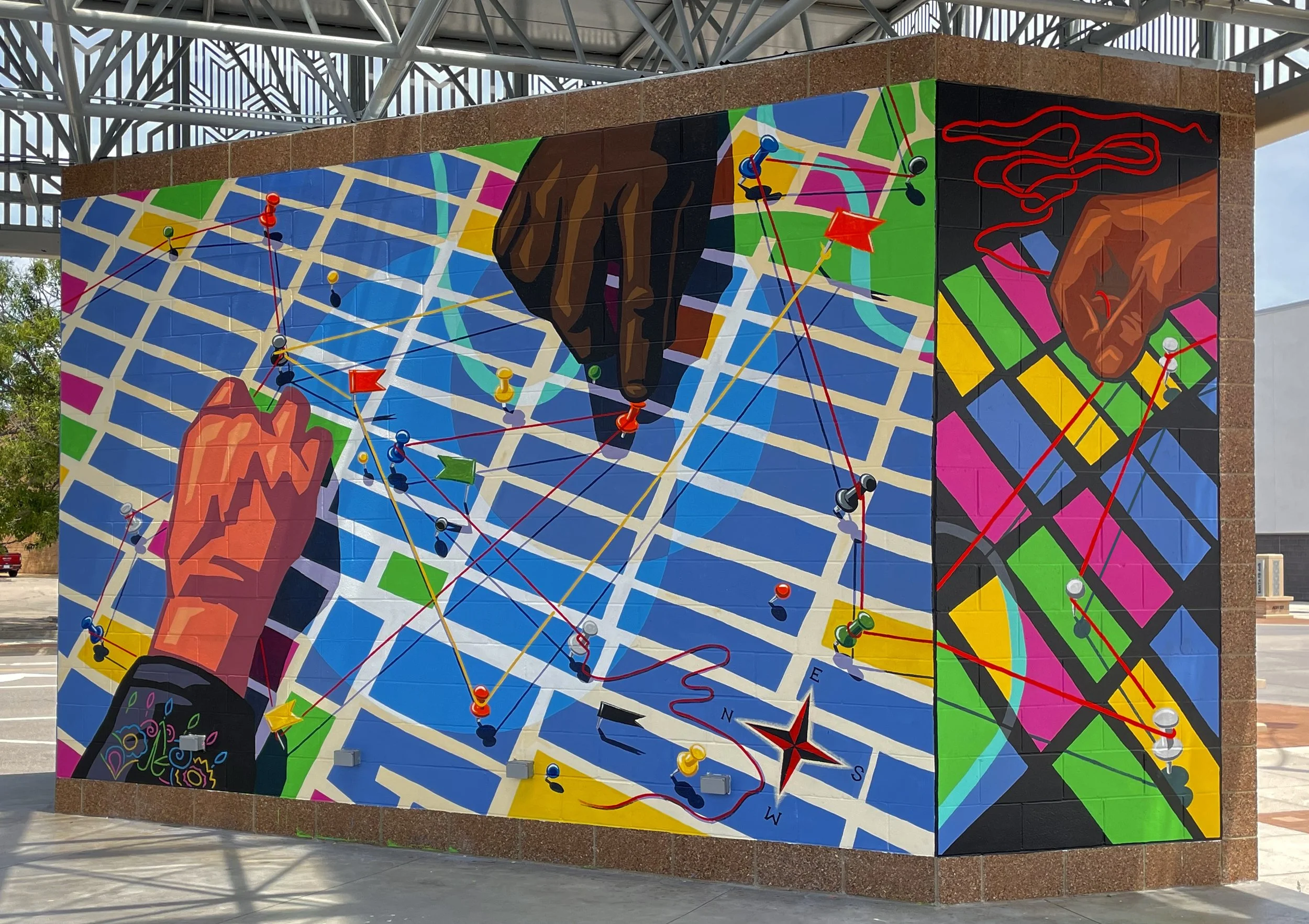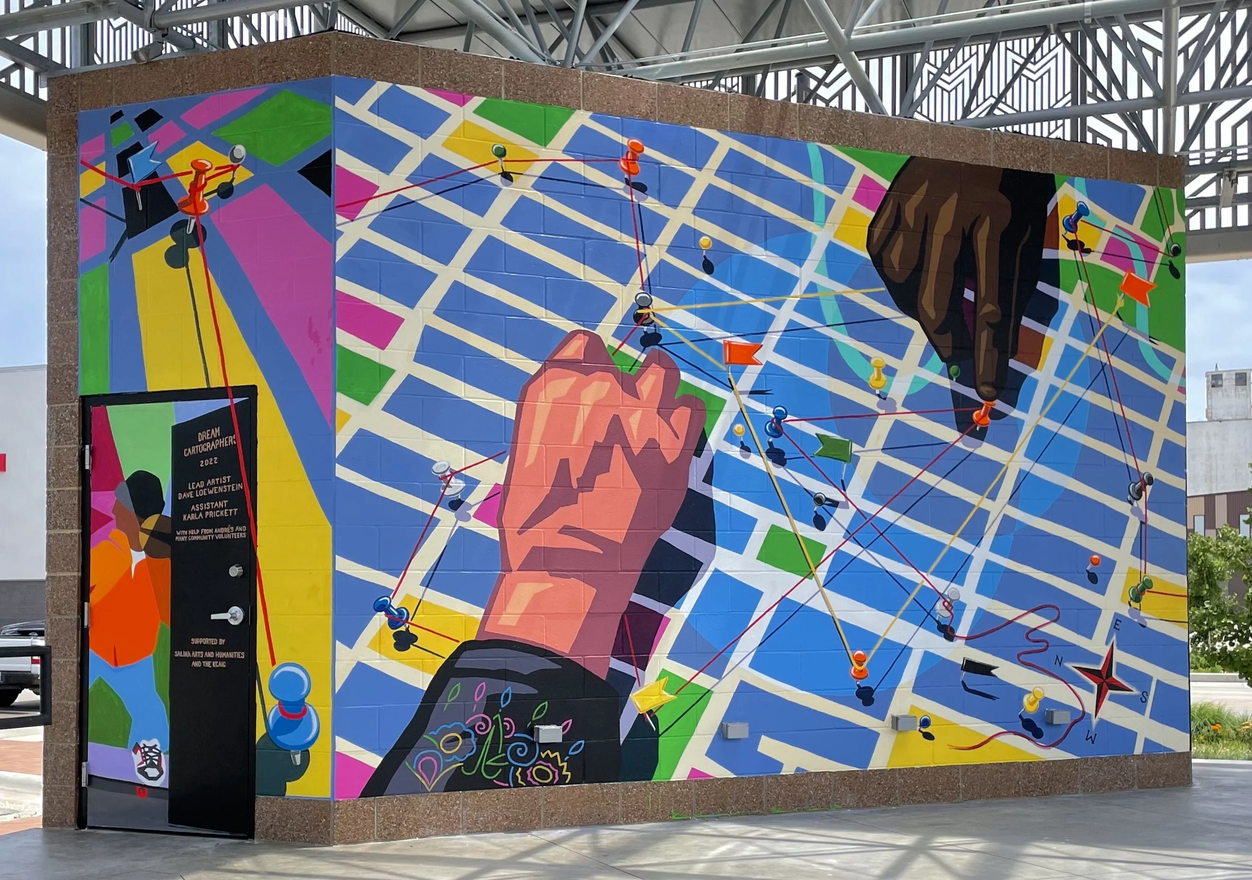 Community workshops, where participants mapped their memories, dreams and personal geographies, inspired this mural for the outdoor stage at Santa Fe and Ash. It was created a few months after the mural I led in 2010, Waiting in the Wings, was removed at a location a few blocks away (look for a reference to that mural inside the “doorway” within the new one). Many thanks to mural assistant, Karla Prickett and the many volunteers who helped us paint. The project was supported by Salina Arts and Humanities and the Kansas Creative Arts Industries Commission.