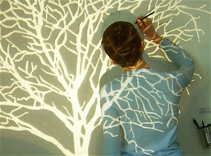 In this collaborative project, participants were invited to share a memory of a tree by writing it within one of the illuminated branches projected onto the wall. By the end of the exhibition, the branches were completely filled with stories, while the actual tree (seen through the window above) had been cut down to make room for a new apartment building. A twelve-page zine documenting the project is available in my shop.