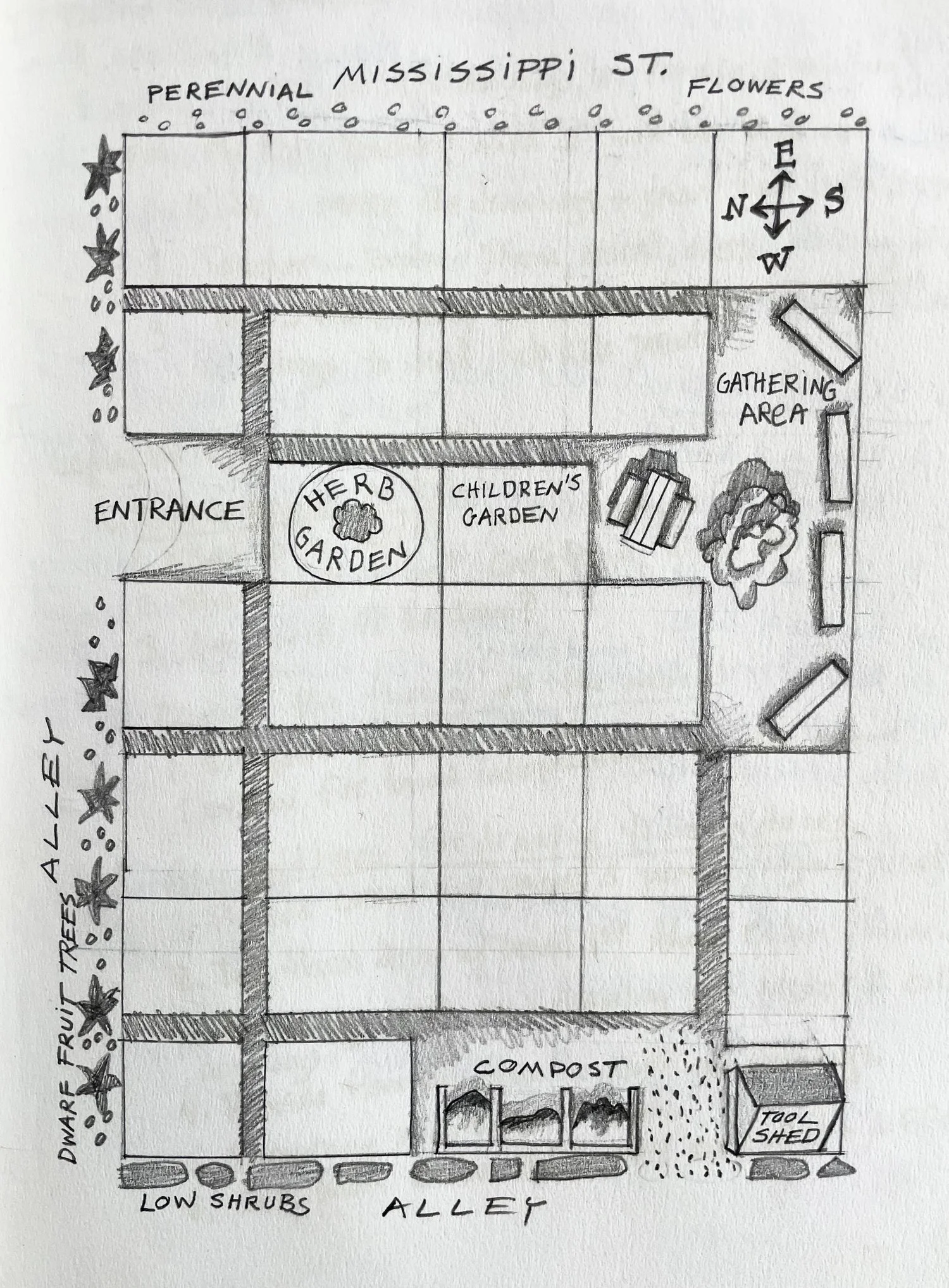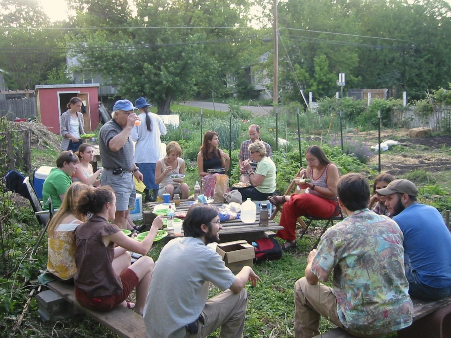 While we waited to get our approval, a couple of us were able to grow a test plot on the space, mostly greens, basil and tomatoes, and got the soil tested. And we explored possibilities for the garden layout and began designing the garden handbook. The layout of the garden was straightforward with individual plots, common areas, a gathering place and a tool shed (later we built a greenhouse). We didn’t need much in the way of money, but we were able to get a CDBG grant through the City which covered our liability insurance, a few tools and supplies to build a fence. The Co-op provided water via a very long hose.