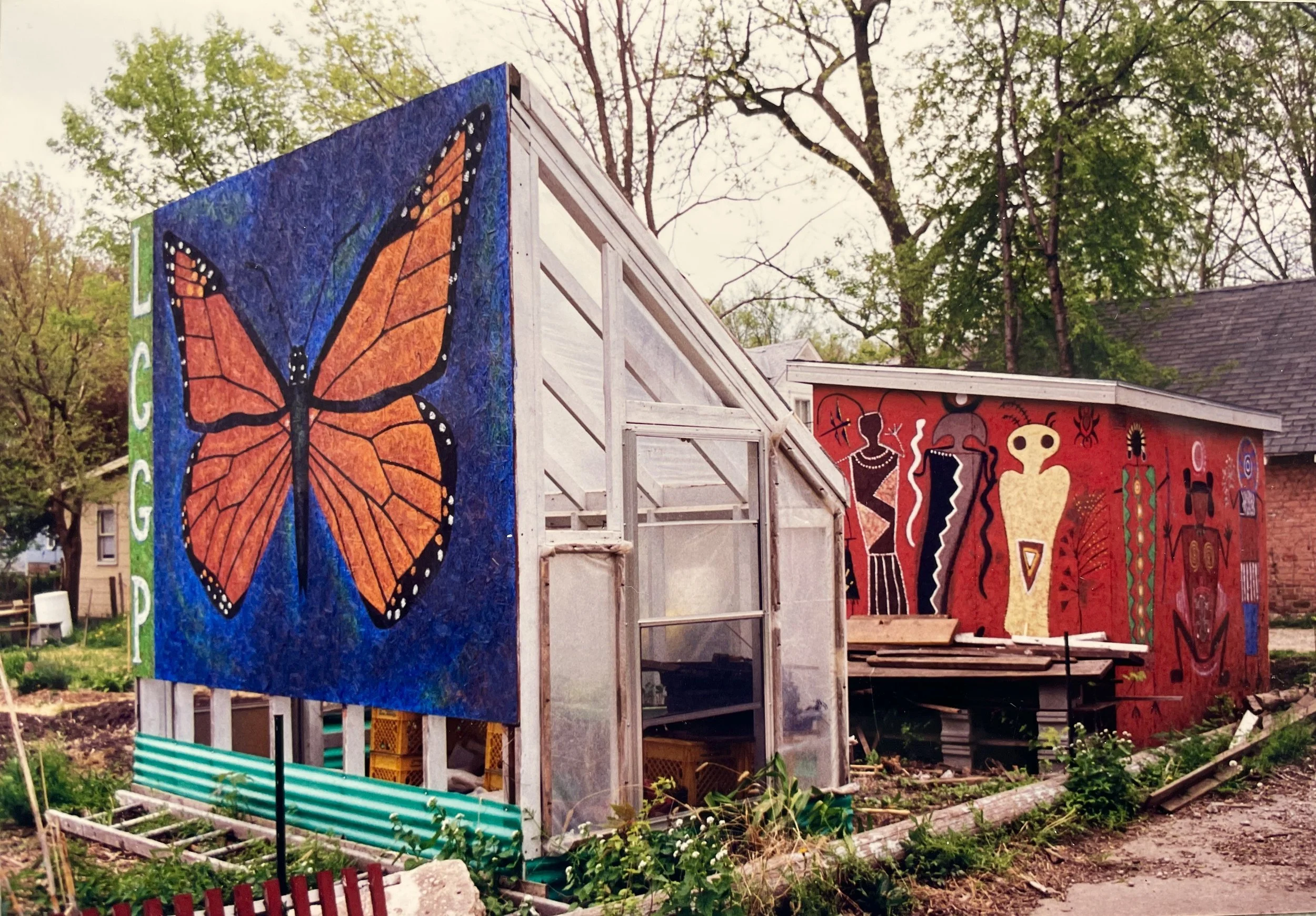We also started selling produce to the Co-op, an arrangement inspired by the new (at the time) garden/market in Kansas City called the Blue Bird. We even had an occasional booth at farmers market to sell produce and share information about the LCGP. The garden thrived. I helped coordinate it for about ten years (until my schedule as a muralist kept me out of town too much) and I continued to have a plot there until 2017.