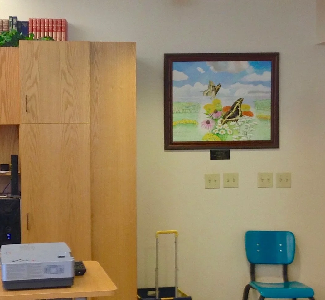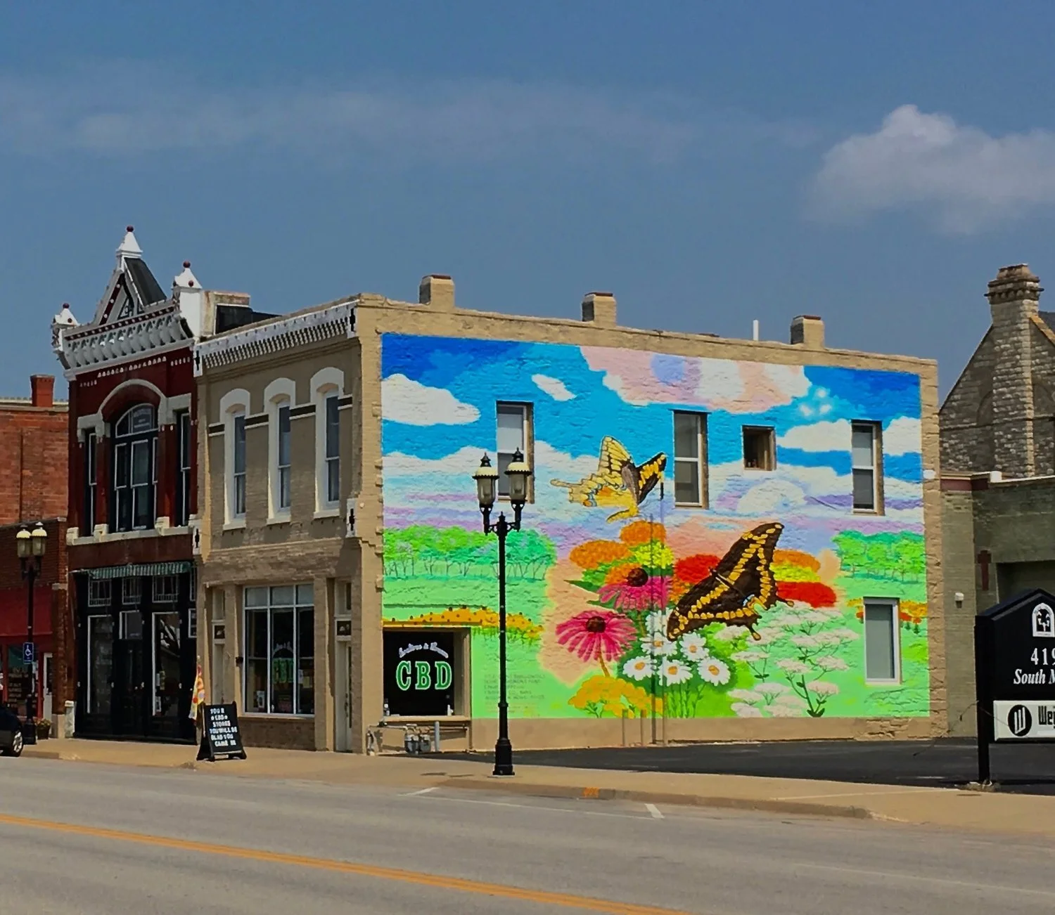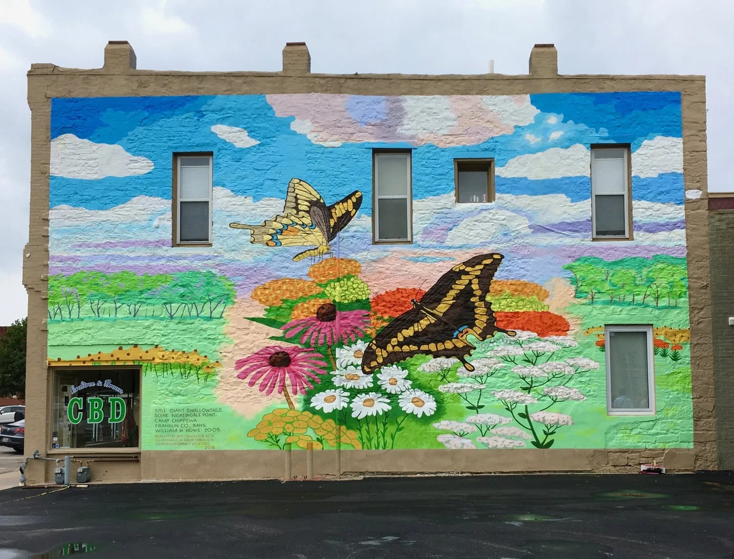 This mural is based on Howe’s 2005 painting depicting the Chippewa Hills, titled “Giant Swallowtails: Nightingale Point” which hangs in the Mound City, KS Public Library. Dave Loewenstein led the recreation with assistance from Sue Dunlap and Callie Mongold and the generous support from the community.