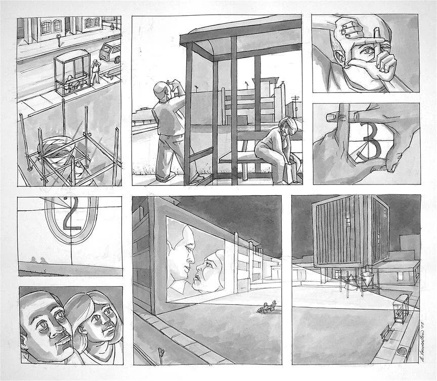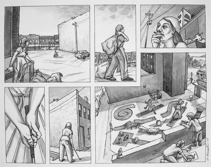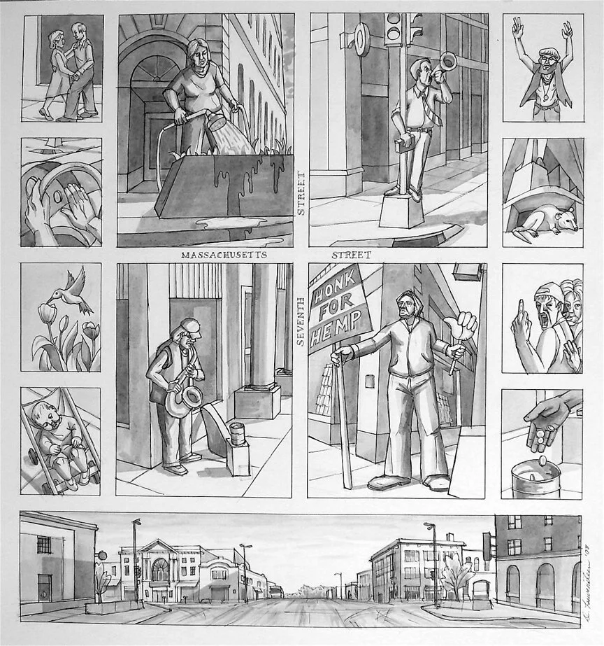 Just about everyday between 2003-2023 I walked a path from my apartment in East Lawrence to a coffeeshop downtown and then over to my studio near 9th & New York. It was an unremarkable routine that was for a long time only a way of getting from here to there. Then, after years of being preoccupied with my destination and overlooking what was right in front of me, I started to see (and imagine) the places, creatures and people along this route as settings and actors engaged in the performance of everyday one-act plays. It was a refreshing new perspective as if I had discovered something hidden in plain sight. I looked closer, studying puddle reflections, following snowprint paths, glancing through window frames and tree branches, and exploring alleyways. Part wandering flaneur, part documentarian, and part what-ifer, I began watching snippets of these dramas and comedies unfold, never knowing how they began or how they might end. More overseen than overheard, I gleaned what I could from a distance in written and drawn sketches, and then daydreamed up the rest in the studio, the results being these short stories, all of which take place in a ten-block area in and around downtown.