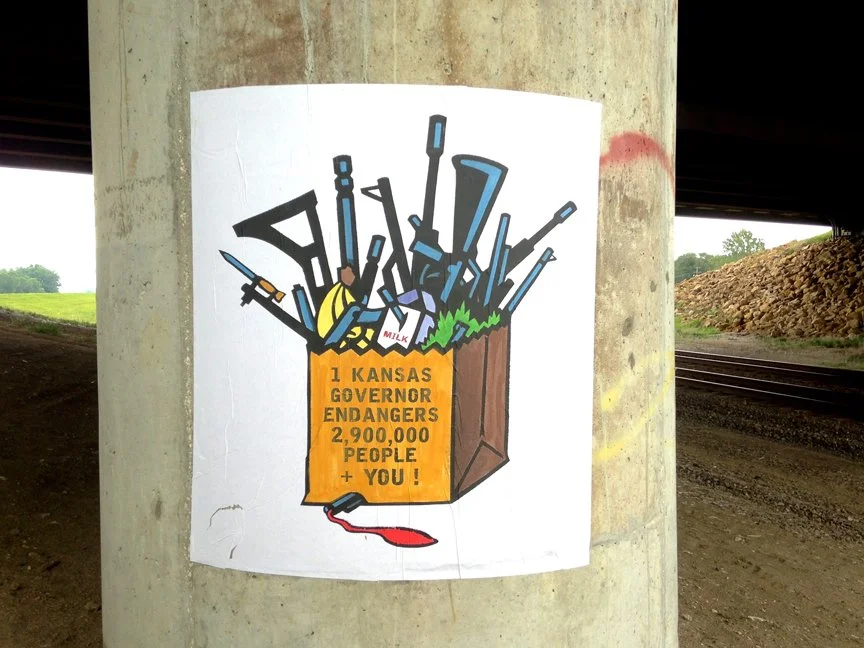 In 2011 when Sam Brownback was elected Governor, Kansas sank into a state of economic collapse and ideological furor, resulting in the dismantling of nearly every state funded agency that served the public good coupled with the erosion of fundamental civil rights. This was due predominantly to xenophobic and cynical policies envisioned and enacted by the Governor and his supermajorities of House and Senate supporters. These posters were my attempt to condemn and satirize the ideologues, while also supporting those who are fighting against them. I hope that soon they will be less necessary.