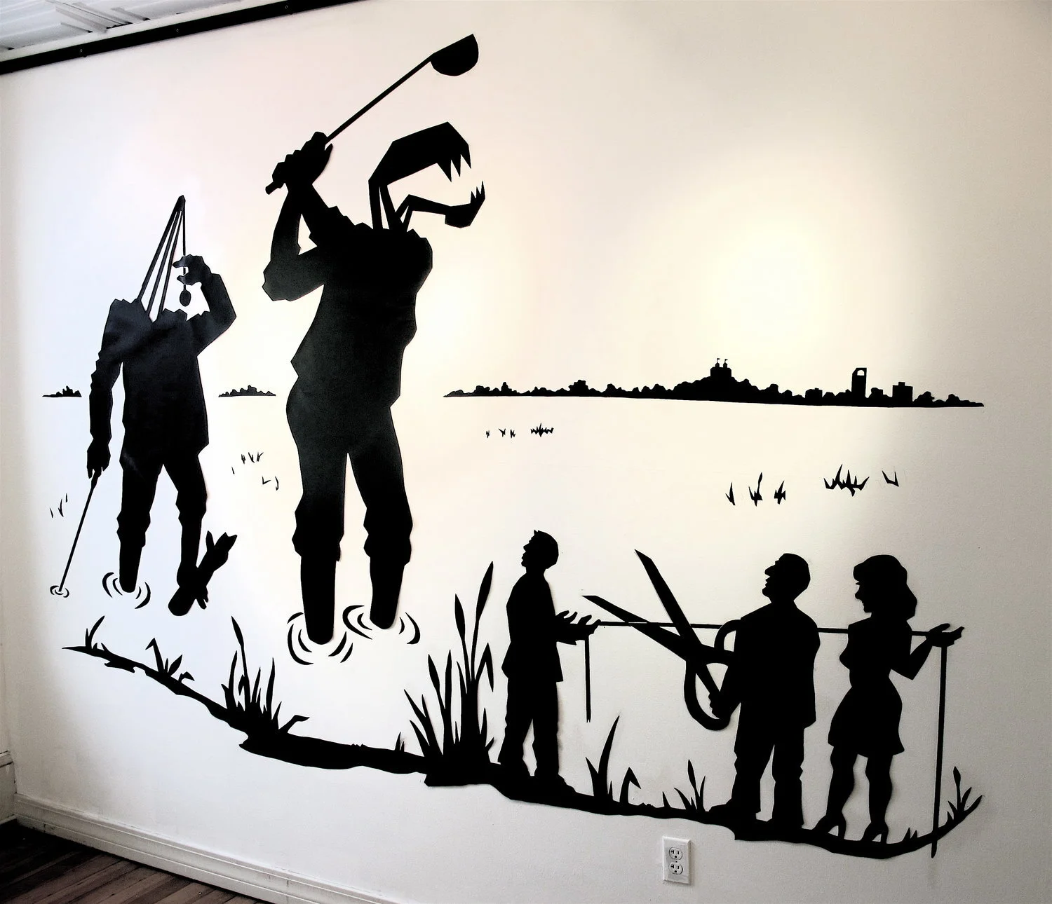 THEM was an installation of cut-paper tableaus and wall paintings that followed Nimbys, Artisinalizers and Frame-up Specialists as they tried to purge their back yards, arts districts and border towns of Them. They were exhibited at the Invisible Hand Gallery in Lawrence in 2011, at 10@BNIM in Kansas City in 2014 and at Missouri Southern Univ. in 2020.