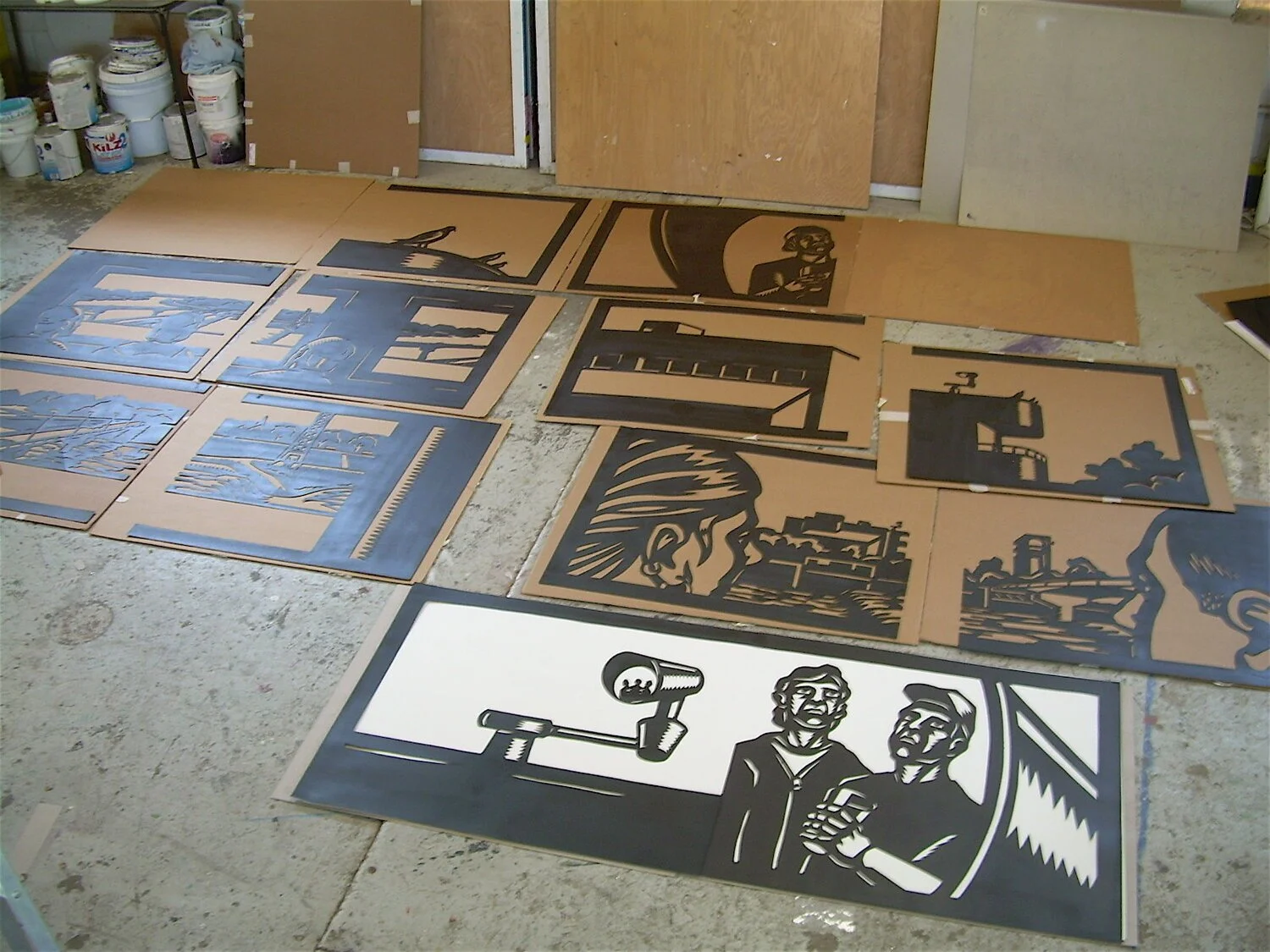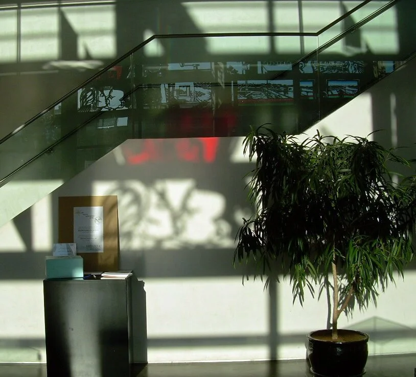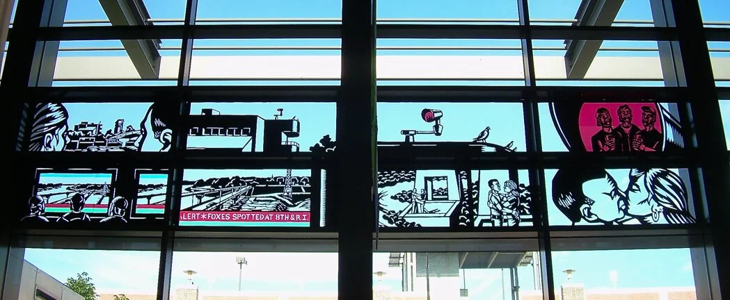 This 2008 window installation for the Lawrence Arts Center imagines bar patrons at Free State Brewery watching the feed from the City Hall tower-cam while a couple across the river shares a kiss for the camera.