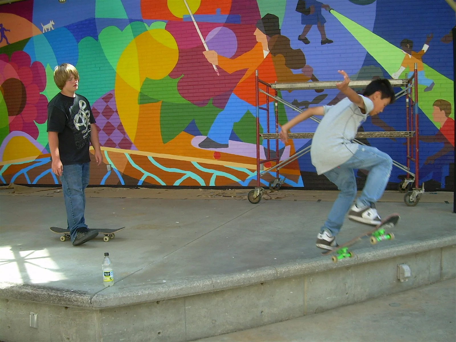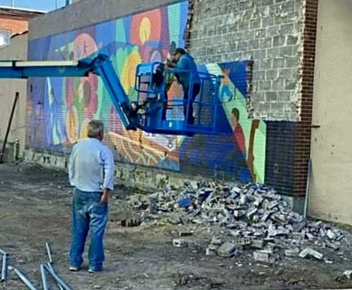 This collaborative mural was developed around the ideas of mentorship and creative exploration. Funded by the National Endowment for the Arts as a part of the Smokey Hill River Festival, the composition is divided into a brightly lit and colorful 'center stage' and shadowed more monochromatic areas 'off stage - waiting in the wings.' Framing the mural on the left and right are representations of theater curtains. The young boy on the right and girl on the left seated in chairs are adapted from the relief above the entryway to Lincoln School. They are mentored/inspired/guided by teachers who pass along tools to help them along as they develop their art. Accompanying these figures 'waiting in the wings' are other figures walking along high wires of artistic exploration. At the edge of the light and shadowed areas of the design, there appear new much larger representations the boy and girl (suggested specifically by Sawan Patidar) as they cross over onto the lit 'stage' with tools of self expression. (Most of these figures are based on Salina folk who posed for the mural). The center 'stage' section of the mural is based on a detail of a tile relief on the United Building designed by Charles Shaver.