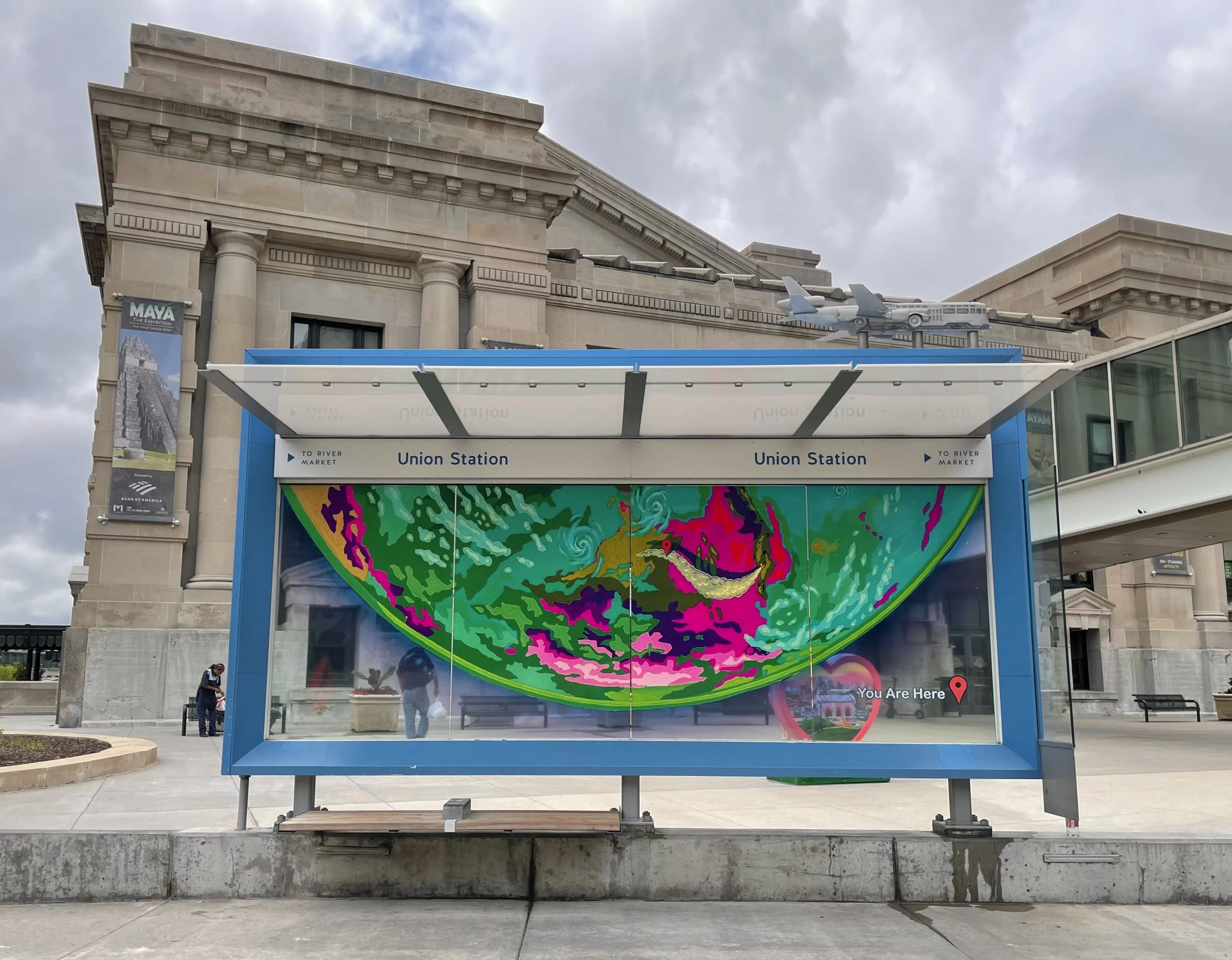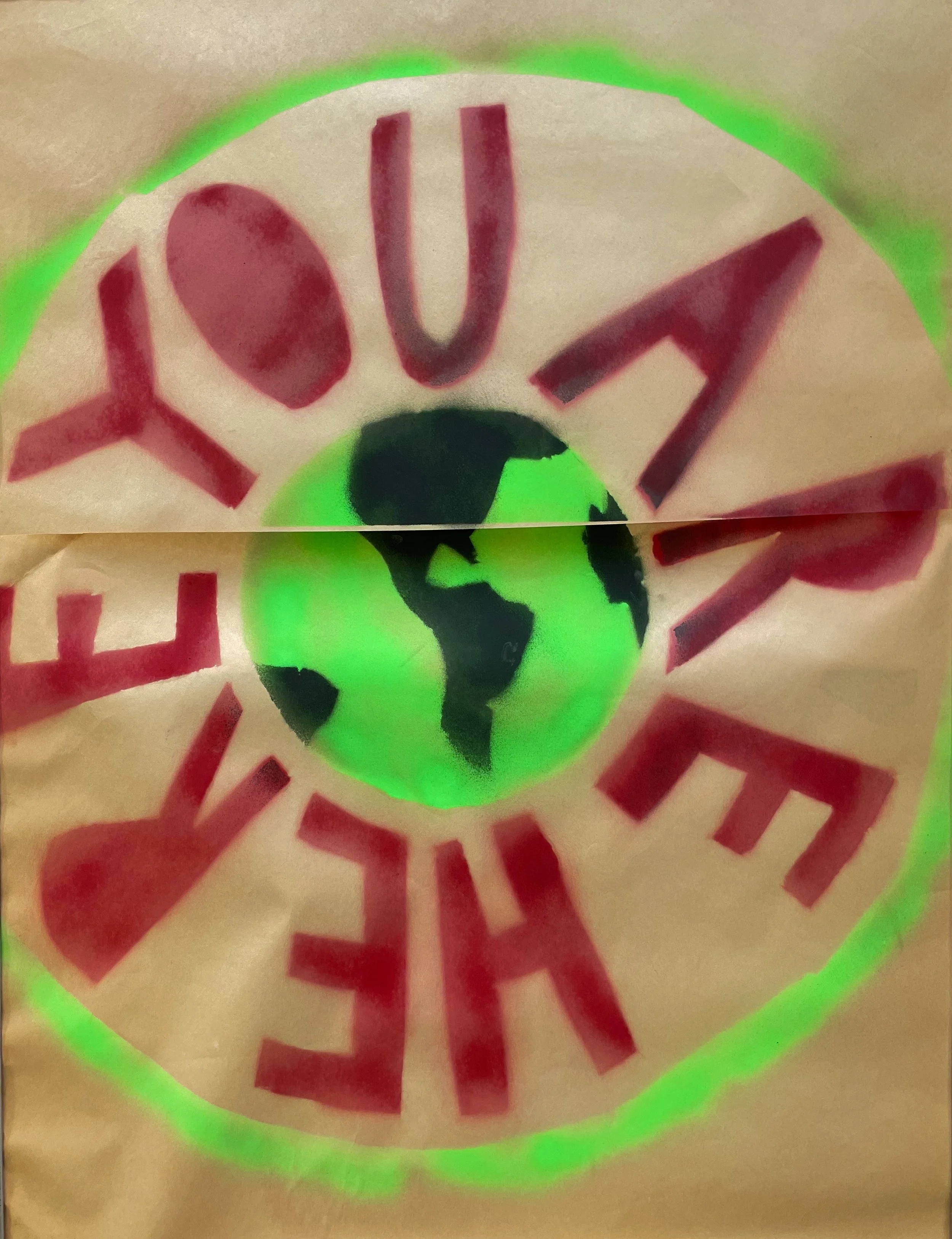 Created for Art in the Loop along the KC Streetcar route, this image shows the earth as it dips down from above with North America at the center. For many, it will look upside down with north at the bottom and south at the top. Viewing the planet from this uncharacteristic angle presents the possibility of reorienting ourselves to the place we all live without the assumptions and regional discriminations that come with national borders and notions of south and north that have been hard wired into nearly all modern images of earth. An earlier version of this idea became the centerpiece for the mural, Tiempo de la Tierra, and to the right is a spraypaint stencil I made in 1992 for Earth Day that first combined the text You Are Here with an image of the planet.